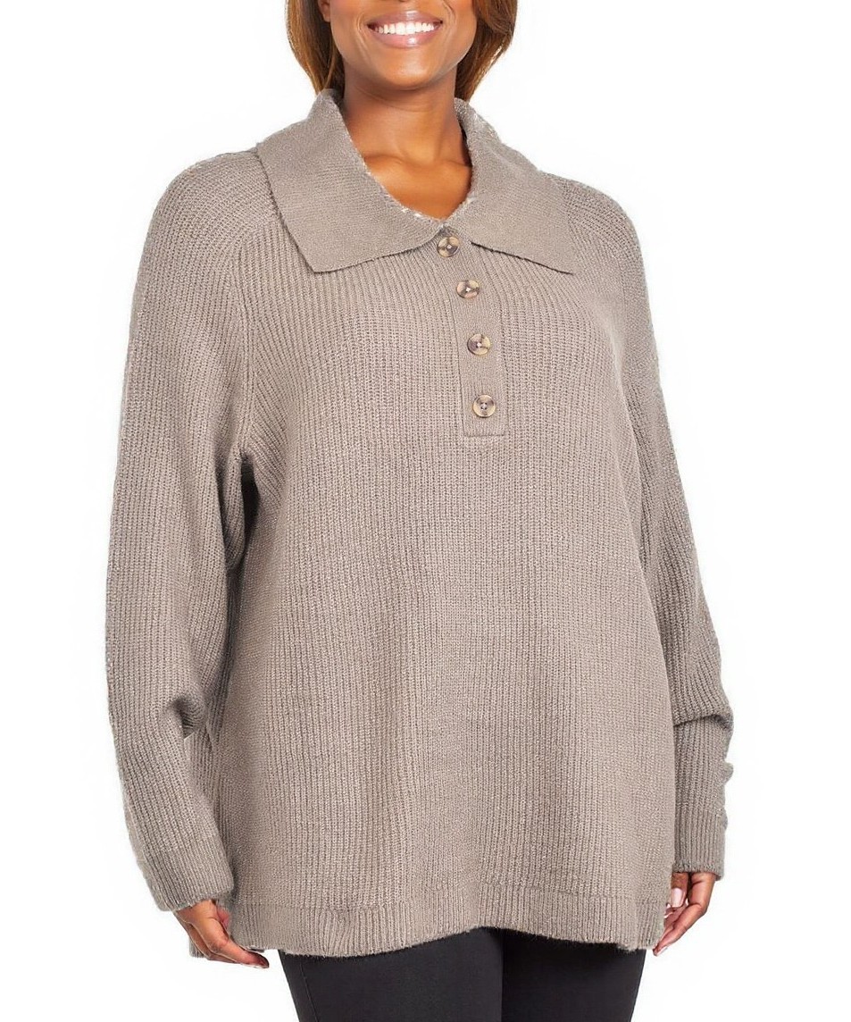 Уютен дамски пуловер в бежово-кафяв нюанс, плетка с релефна текстура, широк силует, дълги ръкави и якичка с копчета. Идеален за ежедневие и слоево обличане през студените дни. Мек и лесен за пране.