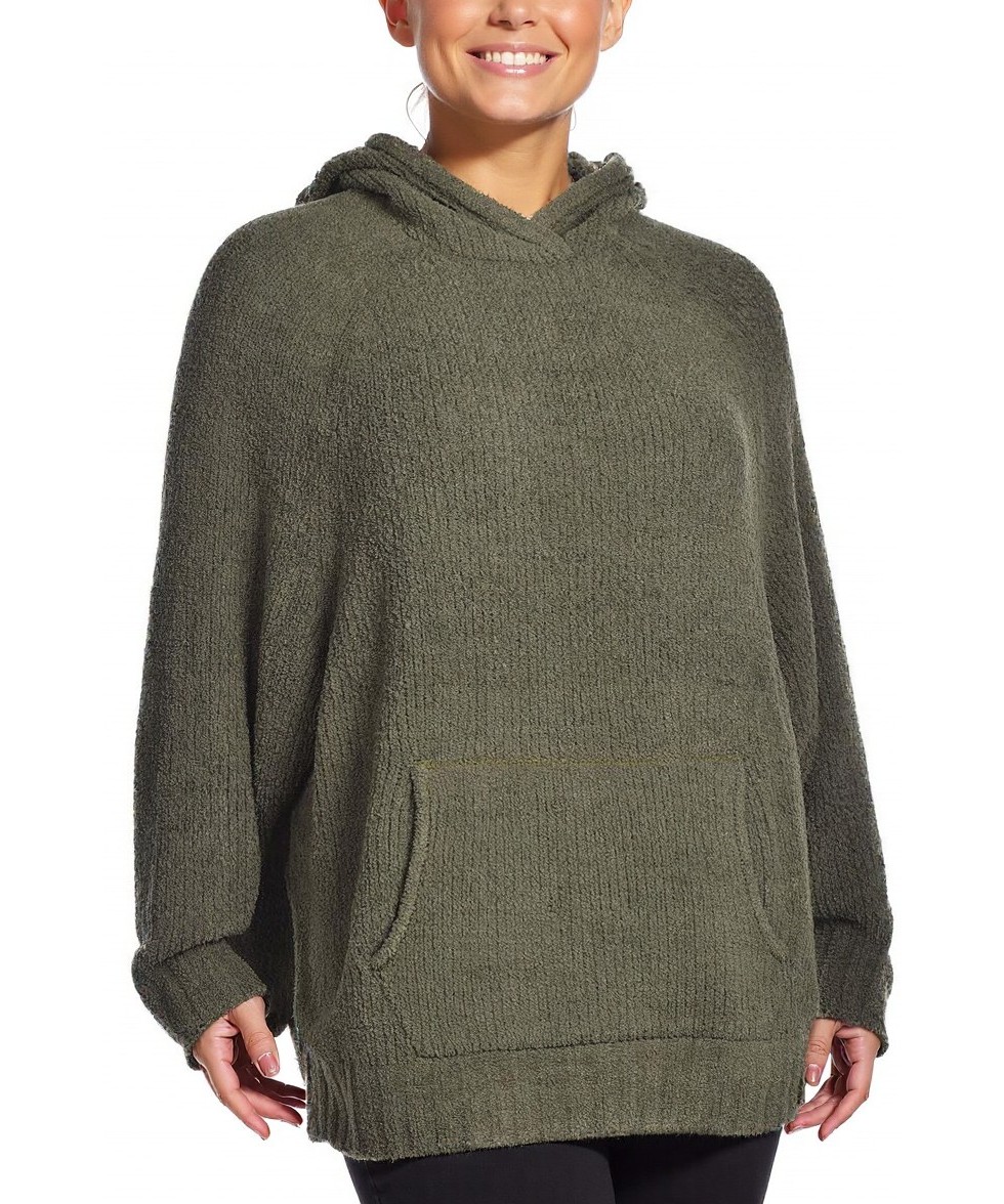Мек дамски пуловер с качулка в маслено зелено. Oversize модел от плюшена, топла материя, с кенгуру джоб и дълги ръкави за комфорт и уют. Подходящ за ежедневие, есен и зима.