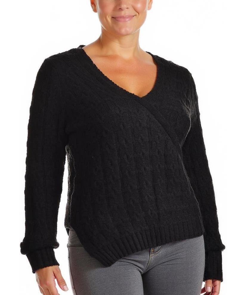 Черен дамски пуловер с релефна плитка, V-образно деколте и асиметричен подгъв. Мек, топъл и стилен модел за всеки ден и за работа. Размери S-XL. Подходящ за подарък Лесна поддръжка, идеален за есента