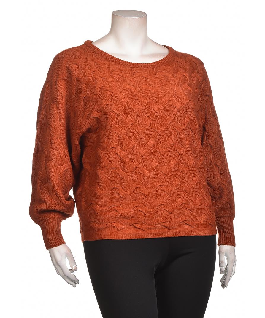 Топъл дамски пуловер в керемиден цвят с плетен релефен десен, свободен силует и спуснати рамене. Мека материя, дълги ръкави с ластични маншети — удобен и стилен за есен-зима - идеален за офис и срещи.