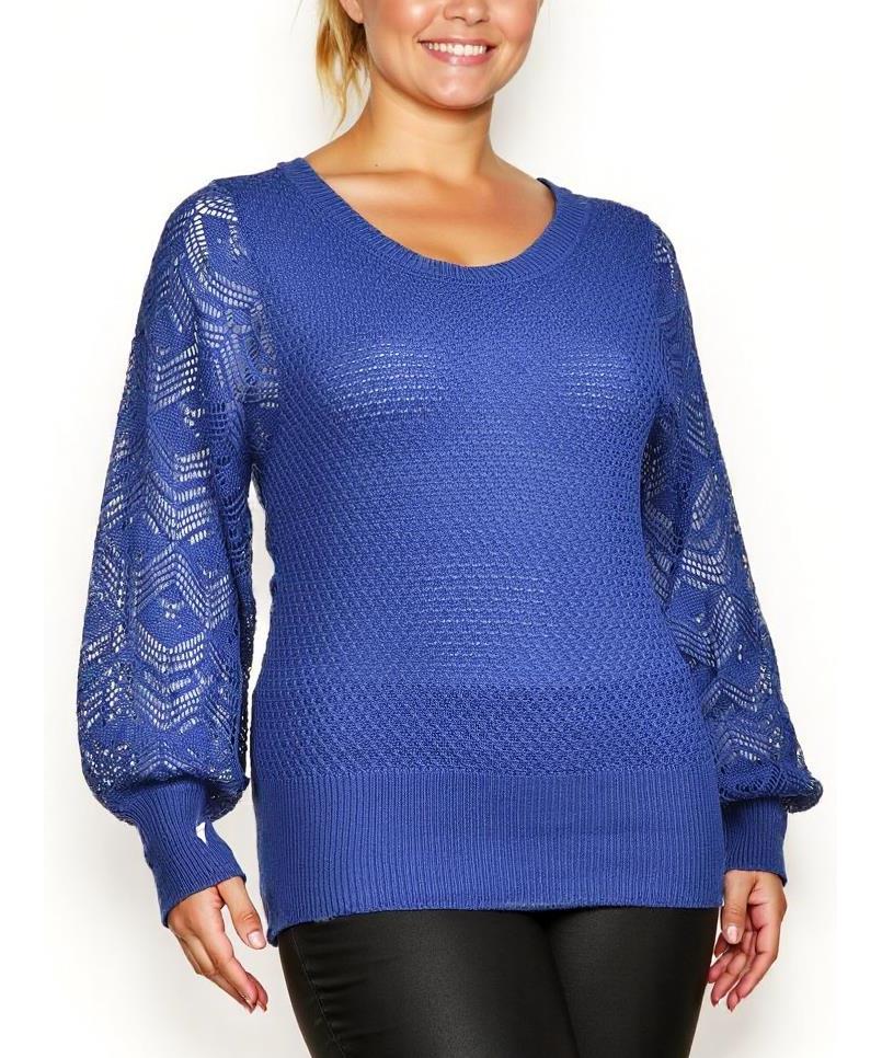 Елегантен дамски пуловер от 100% памук в наситено синьо. Фино плетиво на тялото и ажурни обемни ръкави. Удобен силует, еластични маншети и долна лента. Подходящ за ежедневен и по-официален стил.Лукс!!