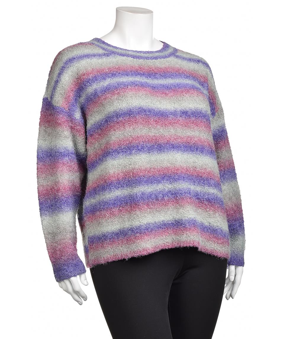 Дамски пуловер от вълна в меки пастелни райета. Свободна, комфортна кройка, кръгло деколте и дълги ръкави. Топъл, пухкав и приятен на допир — идеален за всекидневен уют, офиса и разходки. И за подарък