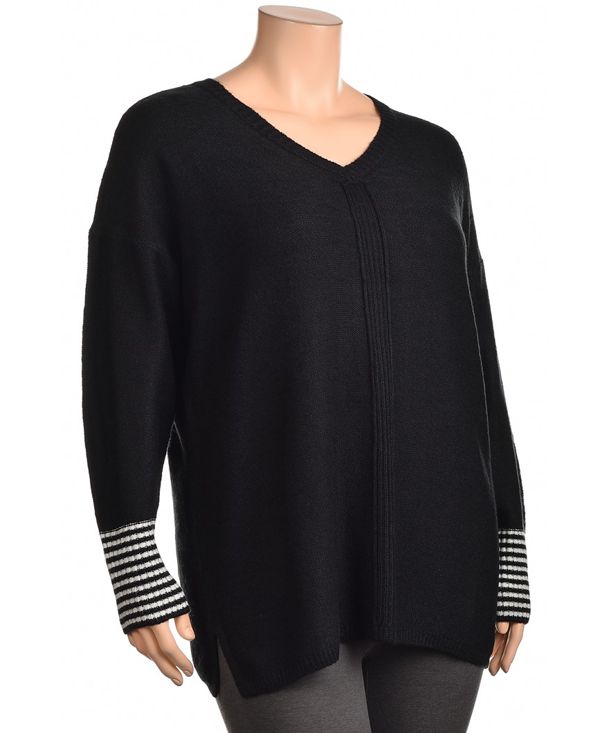 Елегантен дамски пуловер от памук с V-образно деколте, свободна кройка и странични цепки. Черен, мек и дишащ, с контрастни райета на ръкавите. Идеален за всекидневна и стилни комбинации. За всеки ден.