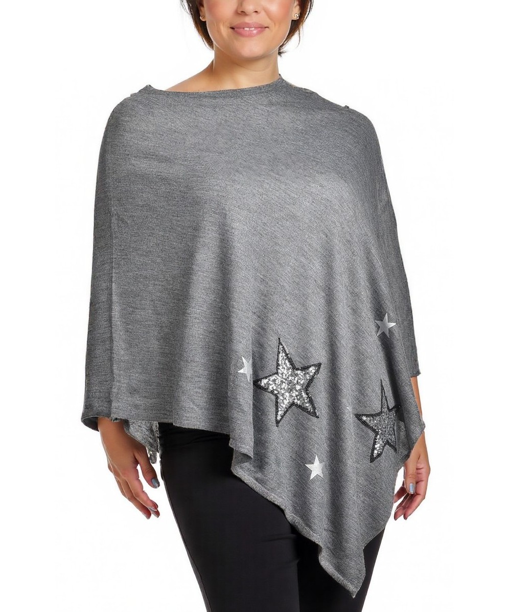Елегантно дамско пончо от мек вълнен микс в сив меланж. Свободен асиметричен силует с пайетени звезди, топло и удобно, перфектно за ежедневна визия и уютни вечери. Лесна поддръжка, идеална за подарък