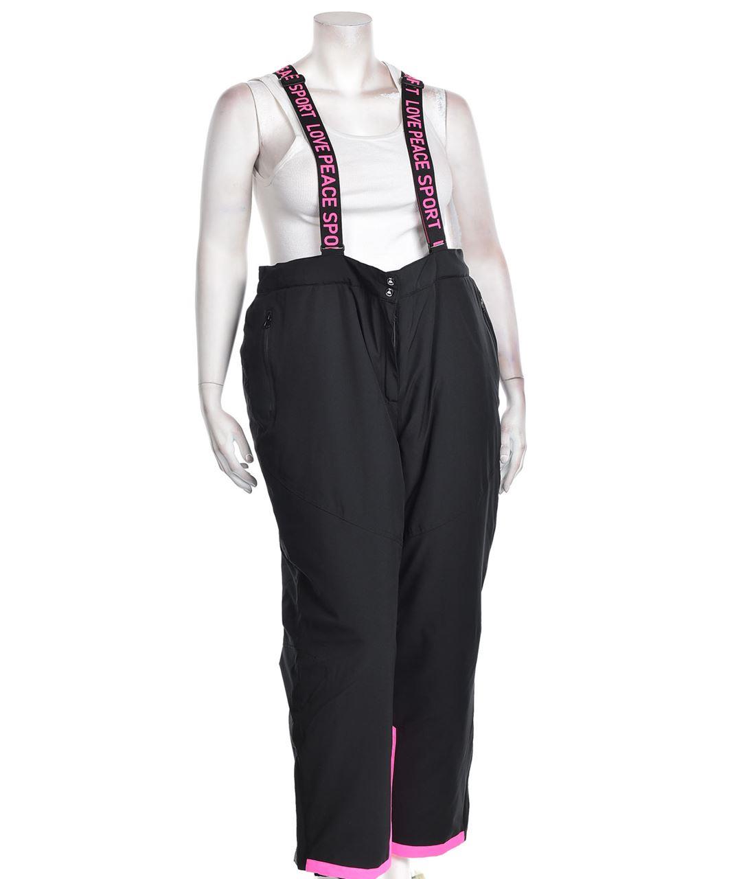 Дамски ски панталон, водоустойчив и топъл, с регулируеми презрамки с надпис LOVE PEACE SPORT, джобове с цип, подсилени колена и розов кант при глезена. Удобна висока талия.
