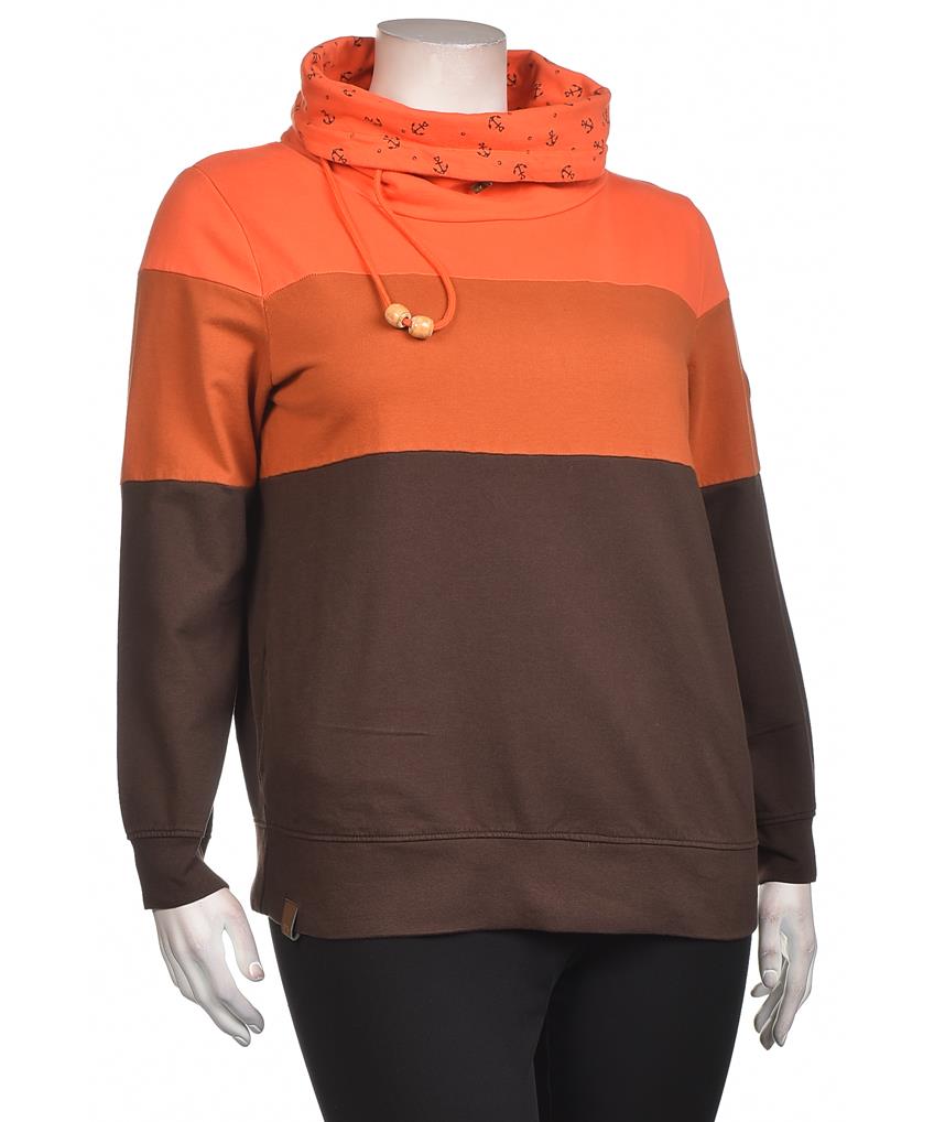 Дамски памучен суичър, удобен и стилен, с широк силует и висока яка с връзки. Контрастни хоризонтални панели в оранжево и кафяво. Мека, дишаща материя за ежедневна употреба. Лесна за пране, подходяща.
