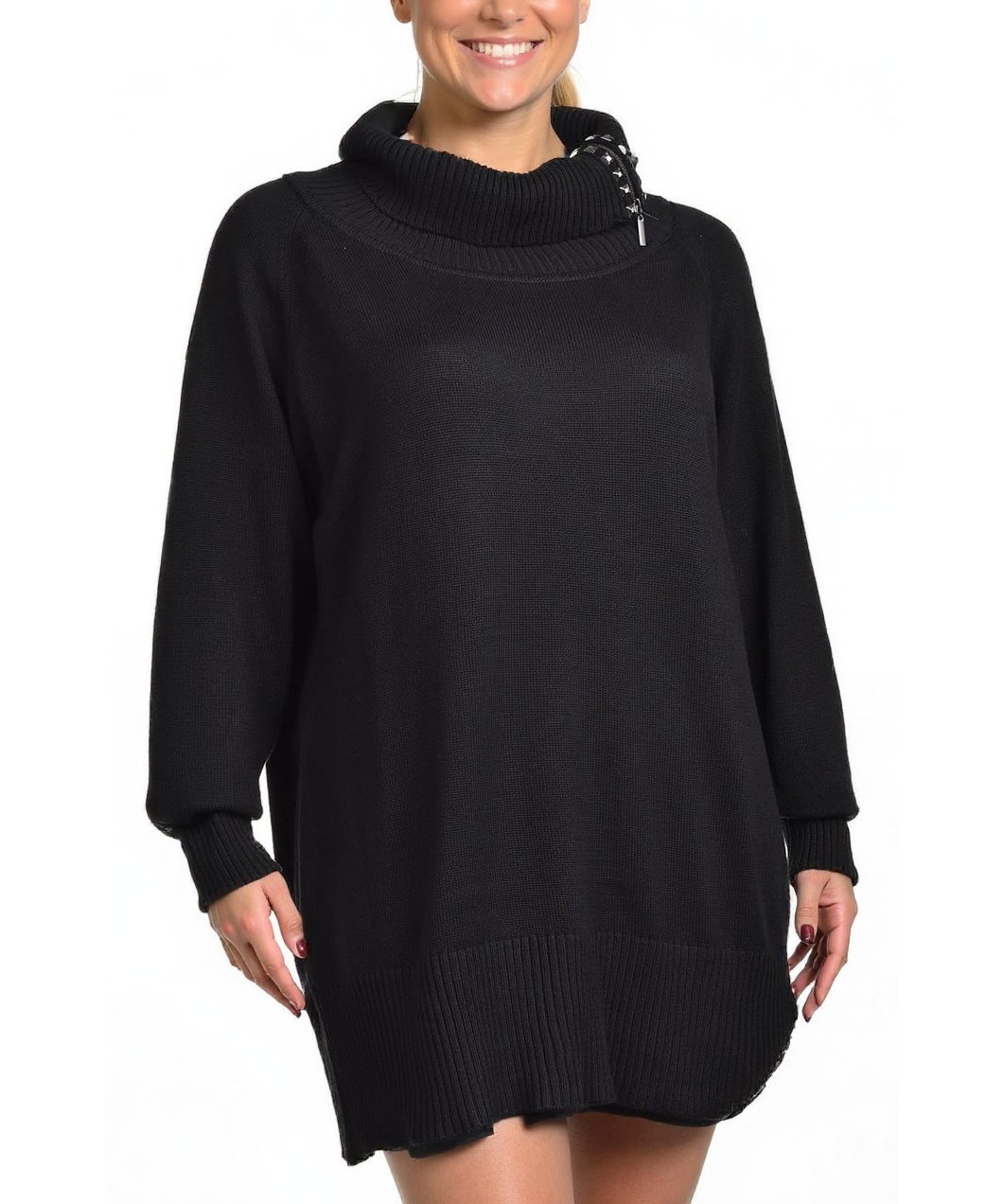 Елегантен дамски пуловер от памук в черно. Свободна кройка, висока поло яка с декоративен цип, рипсени маншети и подгъв. Мек, дишащ и удобен за всеки ден. Лесна поддръжка. Подходяща за офис и уикенд!!