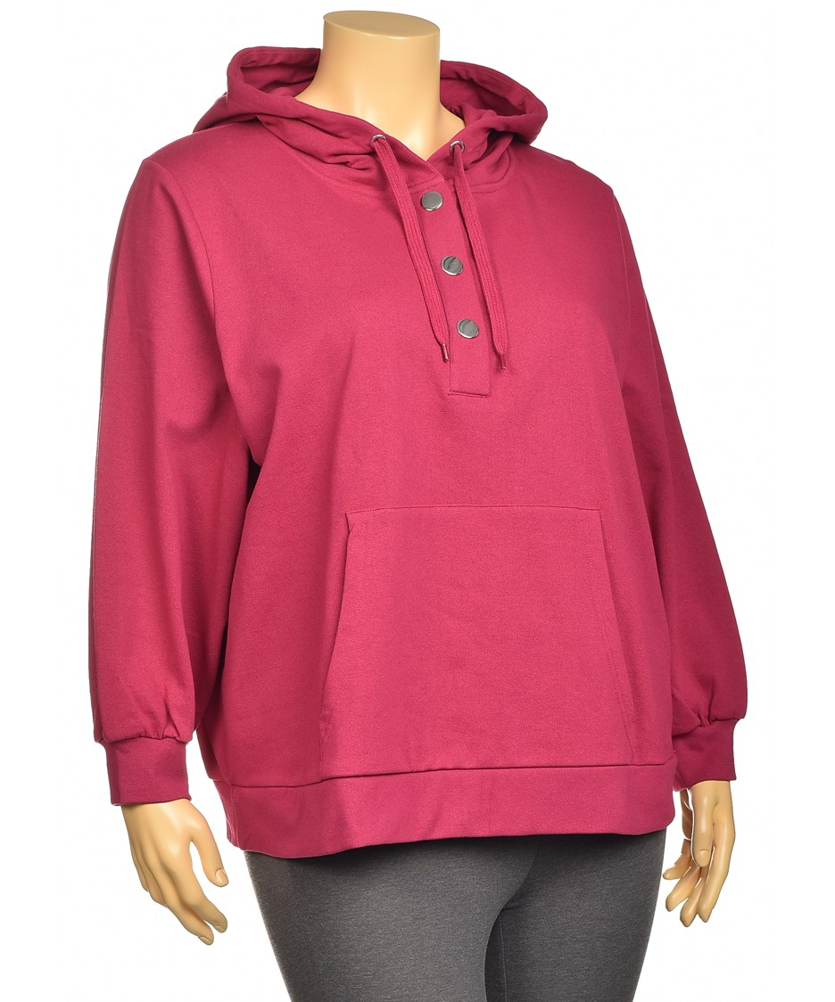 Удобен дамски суичър от 100% памук в наситено розово. Свободна кройка с качулка, джоб тип кенгуру, тик-так копчета и ластични маншети. Идеален за ежедневие и спортна визия. Мека дишаща, лесна за пране