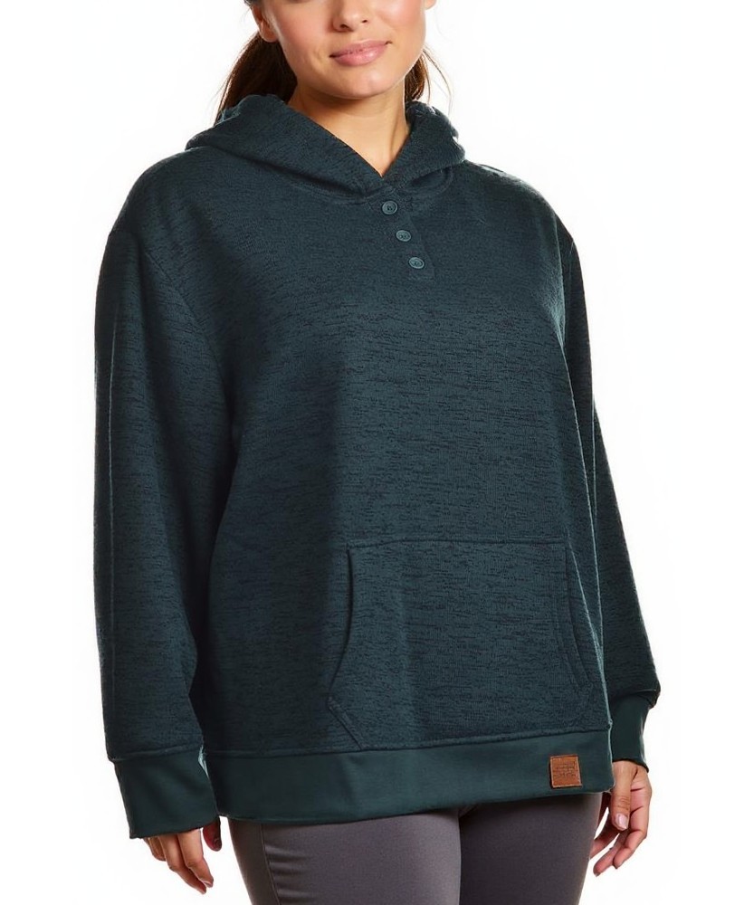 Дамски суичър тъмнозелен меланж с качулка, три декоративни копчета, джоб кенгуру и еластични маншети. Свободна кройка, топъл мек плат - идеален за всеки ден и у дома. Лесна поддръжка, много удобен. Е.