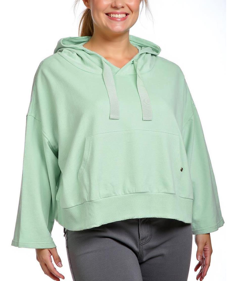 Дамски памучен суичър в пастелен ментов цвят. Разполага с качулка и преден джоб. Меката материя осигурява комфорт и стил, идеален за ежедневно носене. Свободна кройка за удобство.