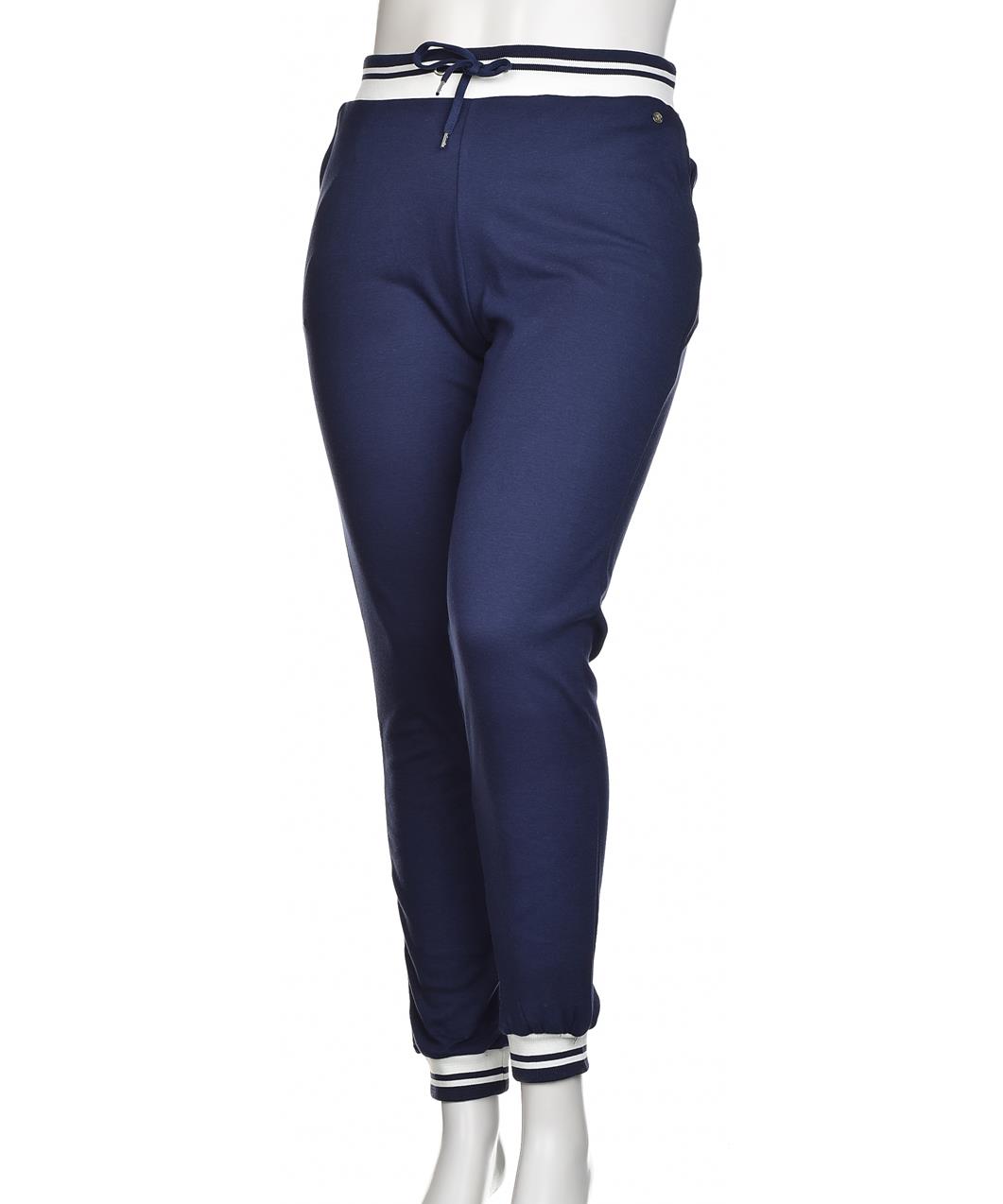Дамско долнище от 100% памук в тъмносиньо, модерна изчистена кройка със спортна еластична талия и връзка, ластични маншети с райе. Меко, удобно и дишащо за ежедневие и тренировки. Подходящи за фитнес.