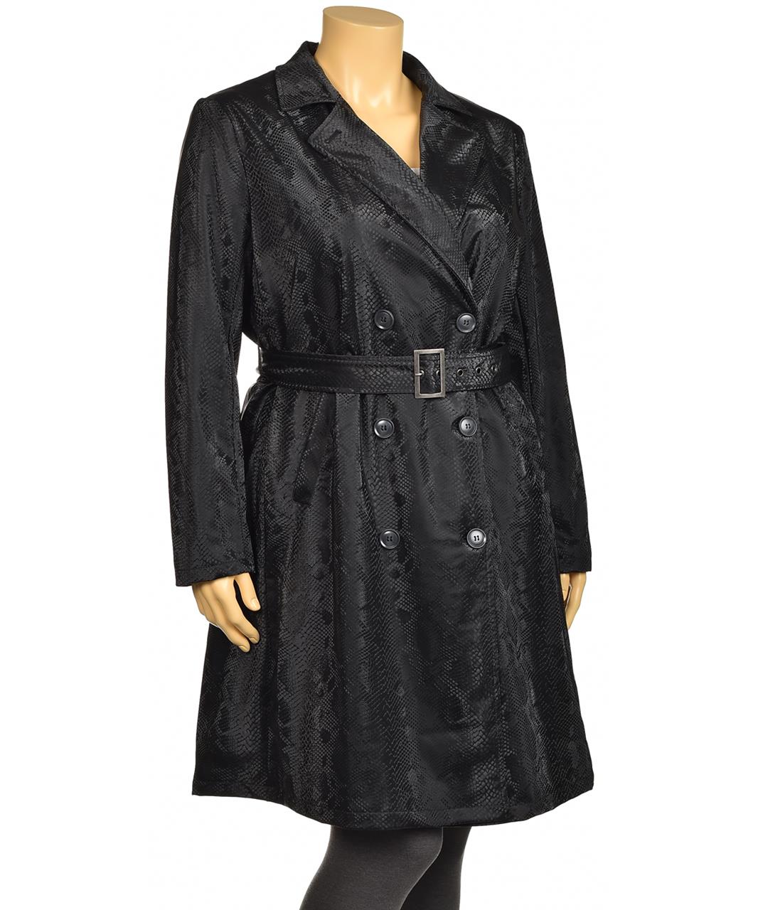 Елегантно дамско черно палто-жакет с двуредно закопчаване и колан. Лека бляскава текстура с дискретен релеф, втален силует, класическа ревера и дълги ръкави — стилно и универсално за всеки повод. 100%