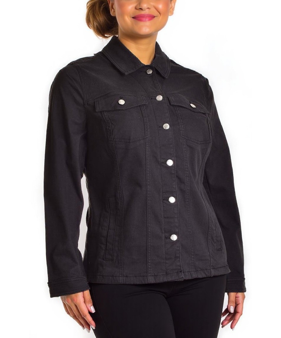 Черно дамско памучно яке с класическа яка и метални копчета отпред. Има два горни джоба и дискретни странични джобове, удобна, права кройка за ежедневно носене през пролет и есен. Лесно се комбинира.