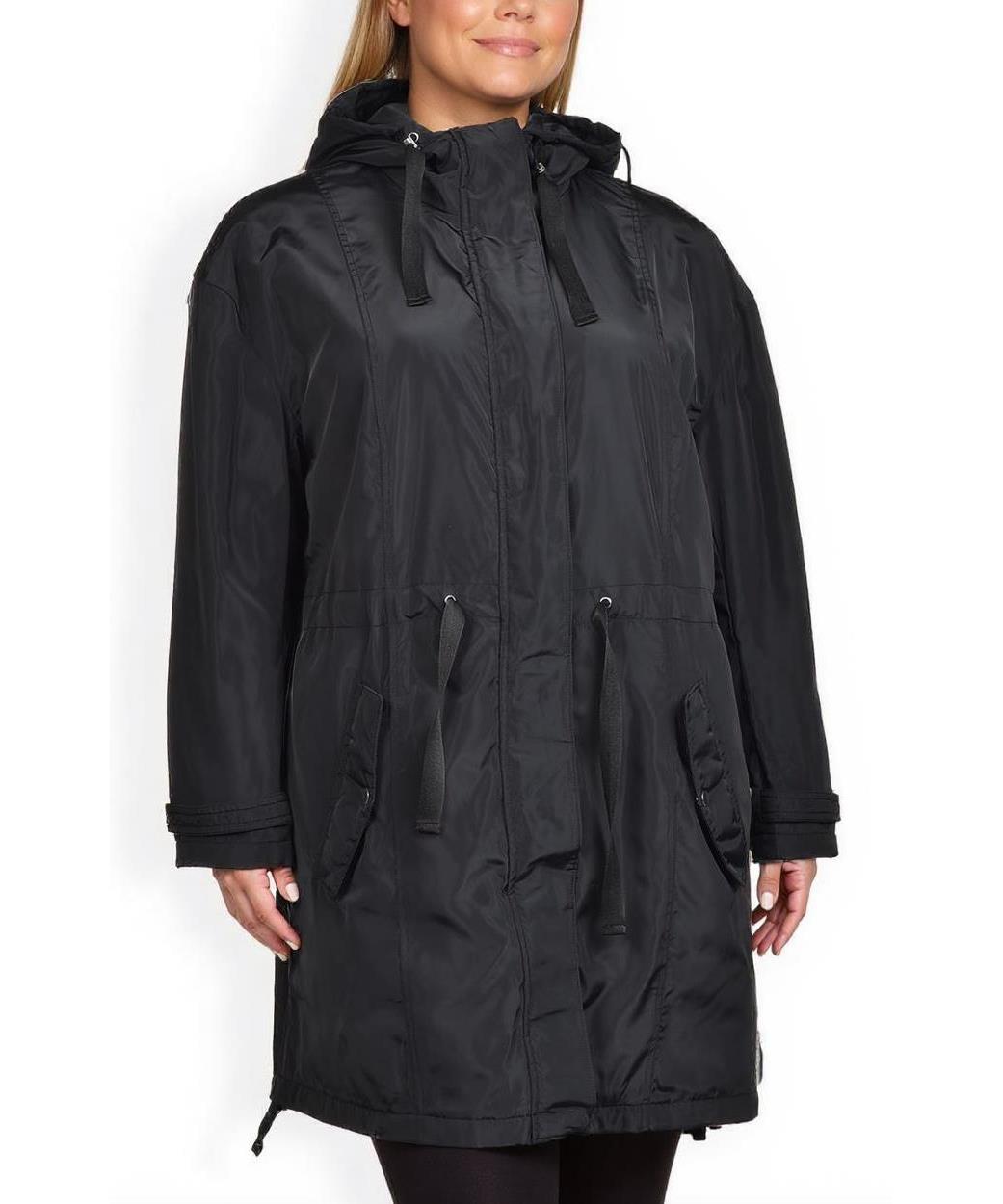 Черно дамско яке с качулка, дълго покритие и връзки на талията. Има удобни джобове, скрит цип и регулиращи маншети. Стилно, топло и практично за есен и зима Лесно комбинира с ежедневен и спортен стил