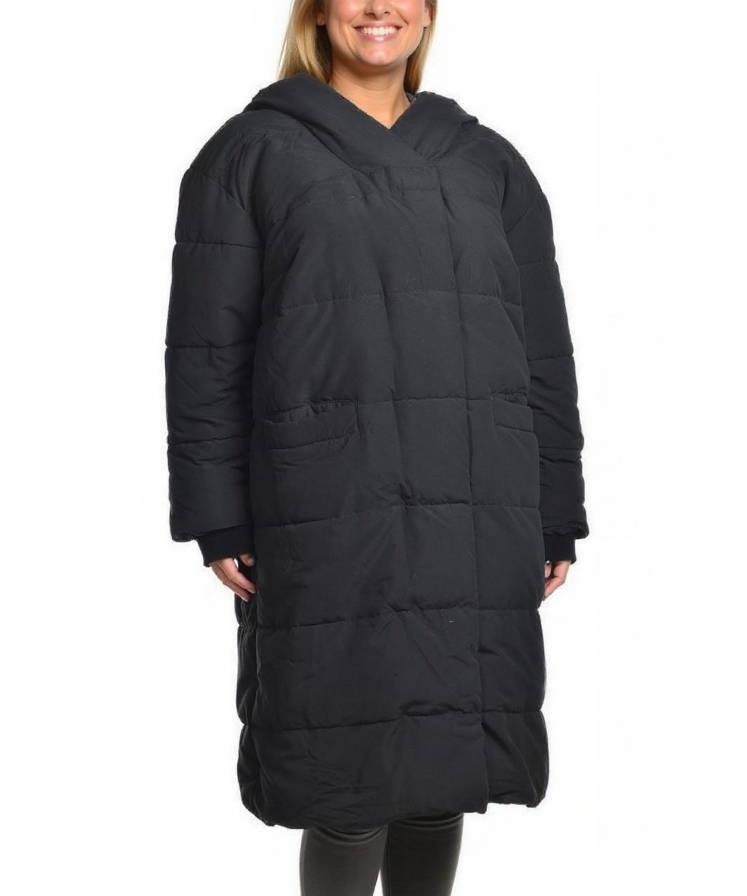 Дълго дамско ватирано яке в черно с широка качулка и презимна подплата. Прав силует, скрити джобове, плътни шевове и топла изолация — идеално за студено и влажно време. Практично и удобно за носене.!!
