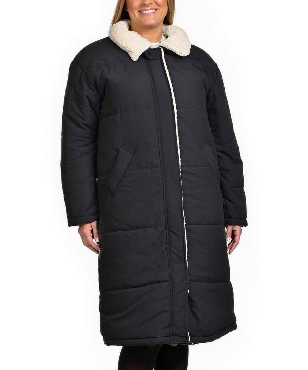 Дълго дамско подплатено зимно яке в черно с мека бяла яка от плюш, цип, удобни джобове и прав силует. Топло, комфортно и елегантно за ежедневието и студените дни. Перфектно за град и планина. Удобна.