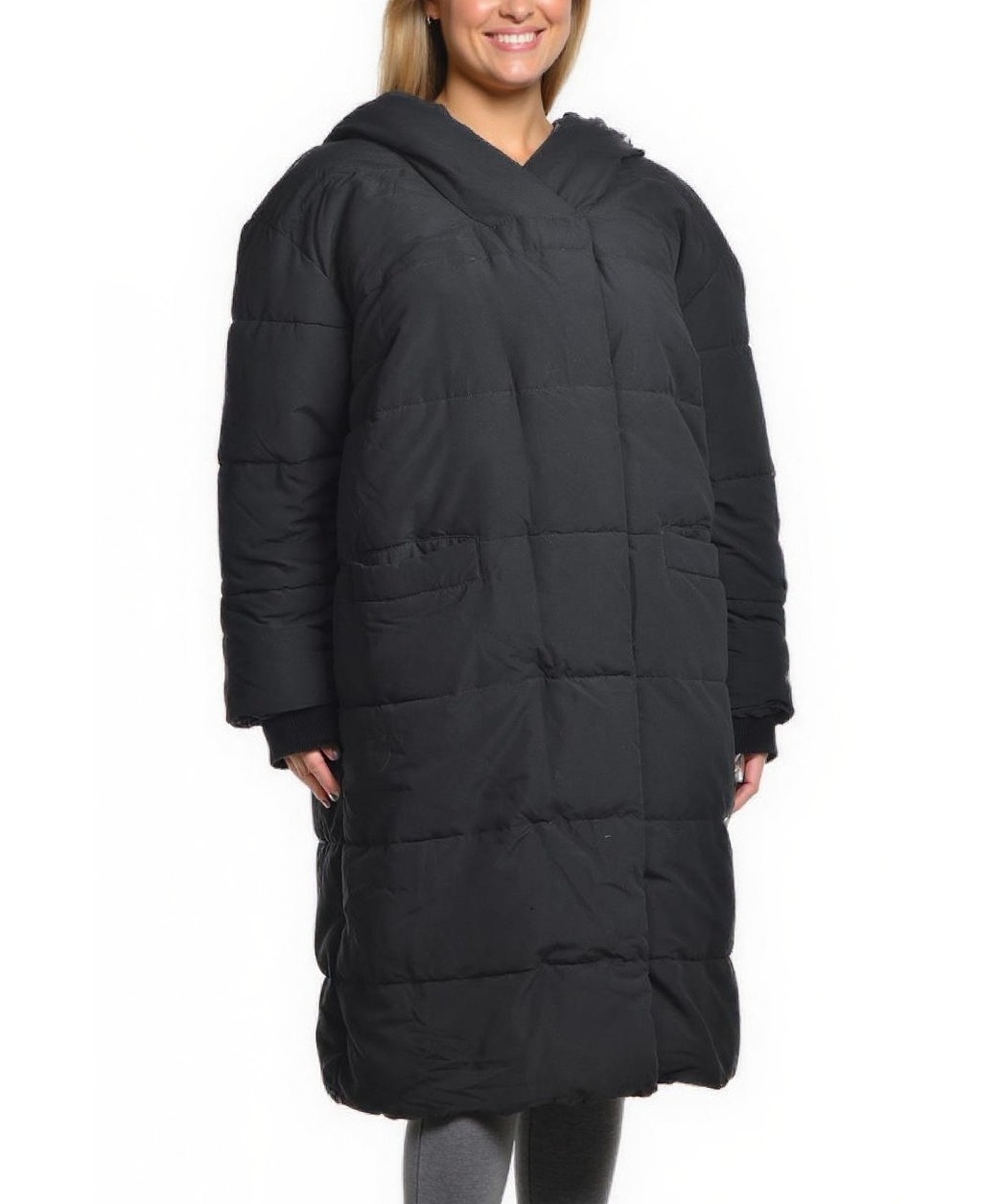 Черно дълго дамско ватирано яке с качулка и квадратно каре. Широк силует, топло и удобно, с джобове и скрит цип. Подходящо за студено време и ежедневно носене със стил. Водоустойчива материя. За града!