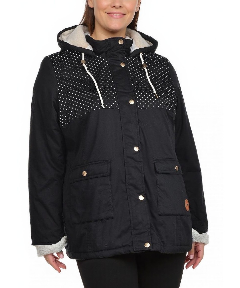 Дамско памучно яке с качулка и топла подплата, десен точки, капацирани джобове и метални копчета. Удобно, стилно и практично за всекидневие и преходни сезони. Лесна поддръжка и траен вид. Стил XXL.