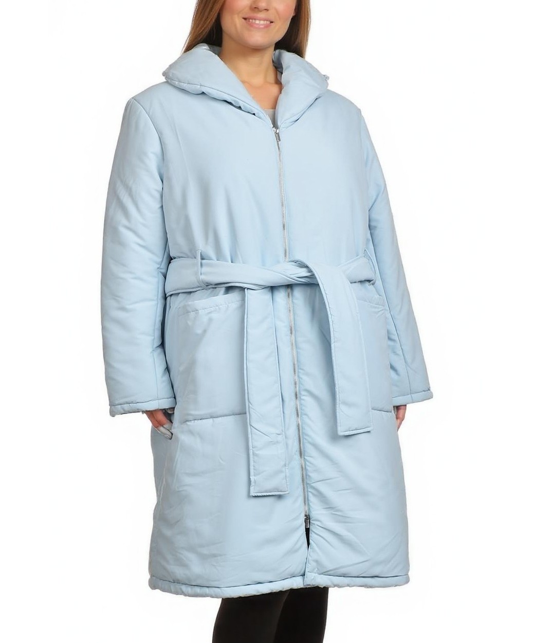 Топло дамско ватирано яке в нежен светлосин нюанс, дължина над коляното, с цип и колан, големи джобове и висока яка. Стилно, удобно и практично за студено време. И идеално за разходки и градски визии
