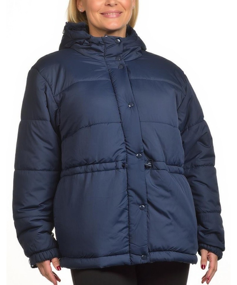 Топло дамско яке в тъмносин цвят, капитонирано, с качулка, джобове и регулируема талия. Закопчава се с цип и тиктакащи копчета, с еластични ръкави и удобна, мека подплата. Подходящо за зимата и есента