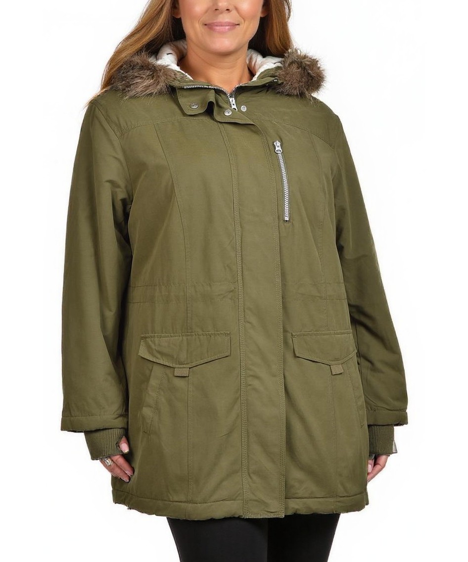 Дамско памучно яке в маслинено-зелен цвят с качулка и пухена яка, цип и тик-так копчета, два предни джоба с капаци, удължен силует и плетени маншети. Топло, удобно и практично за студено време. Стилен