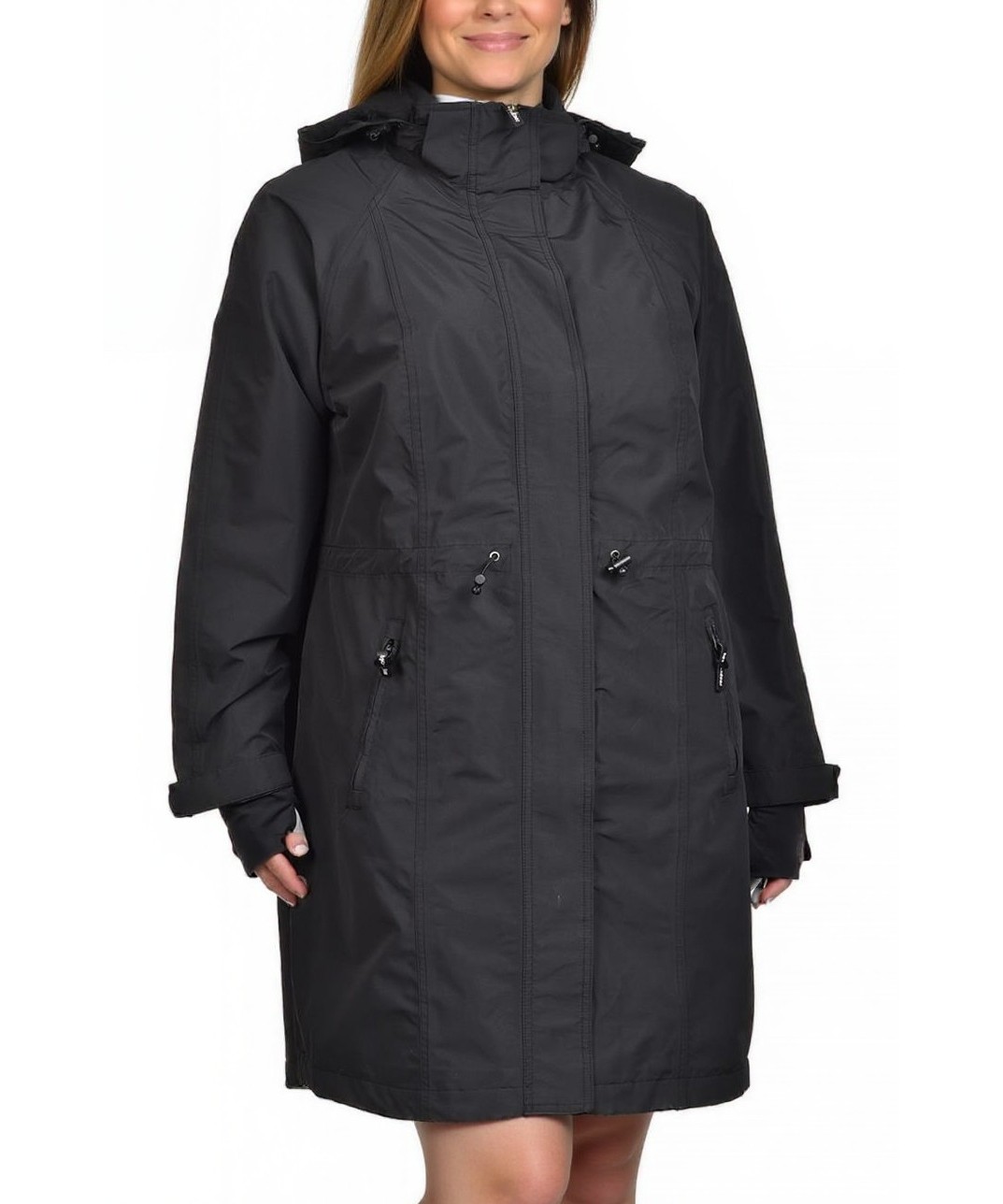 Дълго черно дамско яке с качулка, цип отпред и джобове с цип. Регулируем ханш с връзки, маншети с лепенка и непромокаема материя. Елегантно, топло и удобно за всекидневна употреба. Устойчиво на дъжда.