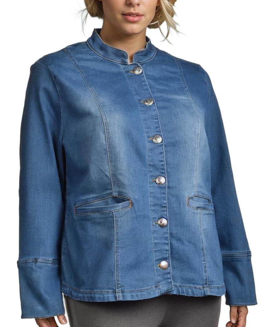 Дамско памучно яке в син деним нюанс с прав силует и правовална яка. Закопчаване с метални копчета, два джоба отпред, мека и дишаща материя, удобен избор за всекидневен стил. Подходящо за пролет и есен.