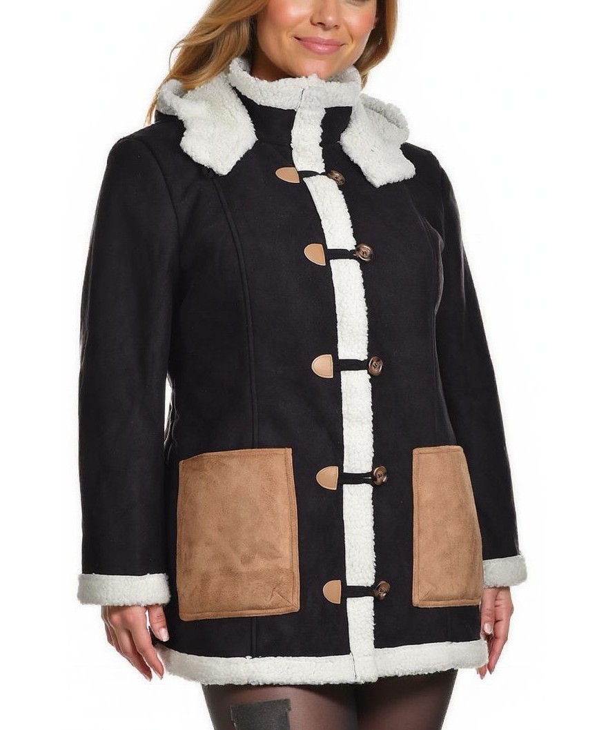 Дамско яке в черно с мека бяла подплата и качулка. Кафяви контрастни джобове, дървени копчета и изчистена кройка. Топло, уютно и идеално за зимни разходки и ежедневие. Идеално за градски разходки.!