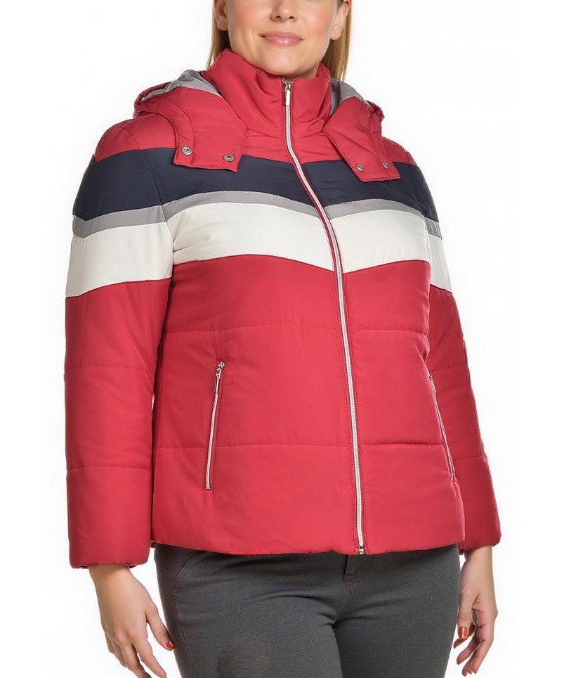Късо дамско подплатено яке в червено с тъмносиньо и бяло рае, с паднала качулка, двупосочен цип и джобове с цип. Топло, удобно и стилно за всекидневна зима. Перфектно за град, работа и пътувания. Стил