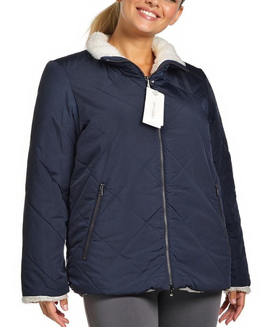 Двулицево дамско яке: елегантно тъмносиньо с диагонална шевица и мека бяла плюшена подплата от обратната страна. Затваря се с цип, има практични джобове и удобна, топла кройка. Подходящо за всеки ден.