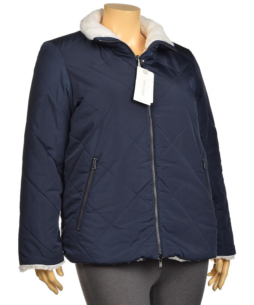 Двулицево дамско яке с класическа кройка и двустранен дизайн. Едната страна е стегнато капитонирана тъмносиня материя, другата — мек бял плюш. Затваря се с цип, има джобове с цип. Стилно и уютно!!!!