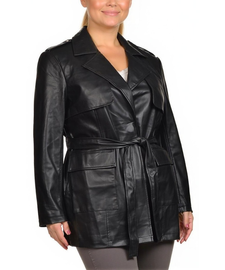Елегантно дамско яке от еко кожа с колан и джобове. Класическа кройка, широк ревер и здраво шевно изпълнение. Идеално за ежедневно и официално облекло през преходните сезони. Топ избор за сезона. Мод.