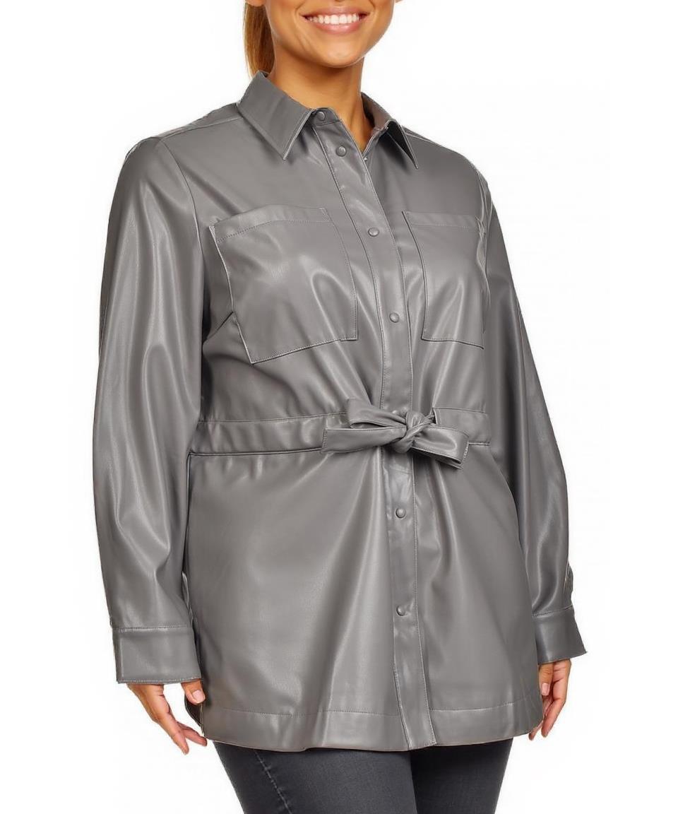 Дамско яке от еко кожа в сив цвят с дълги ръкави. Моделът разполага с два предни джоба и колан на талията, предлагащ стил и комфорт. Подходящо за ежедневието и съчетаване с различни тоалети.