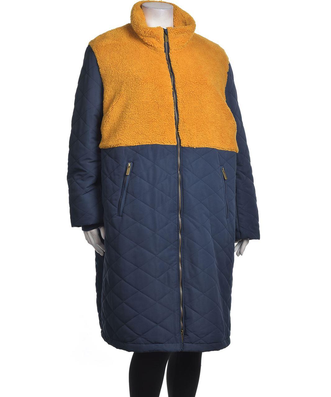 Дълго дамско яке в тъмносиньо с горна част в горчичен пух. Пачворк-шевове, цяло закопчаване с цип, джобове с цип и права, свободна линия. Топло и елегантно за студеното време. Подходящо за есен и зима