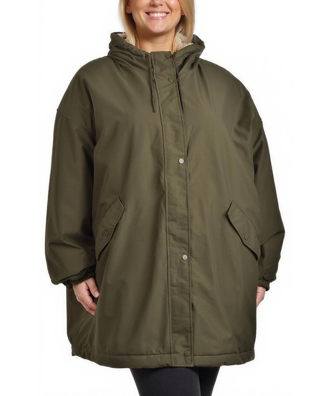 Оверсайз дамско яке в маслинен нюанс с качулка и практични джобове с капаци. Дълго, с централно закопчаване и еластични маншети за уют и защита през преходните и зимни дни. Стилно за всеки гардероб.!