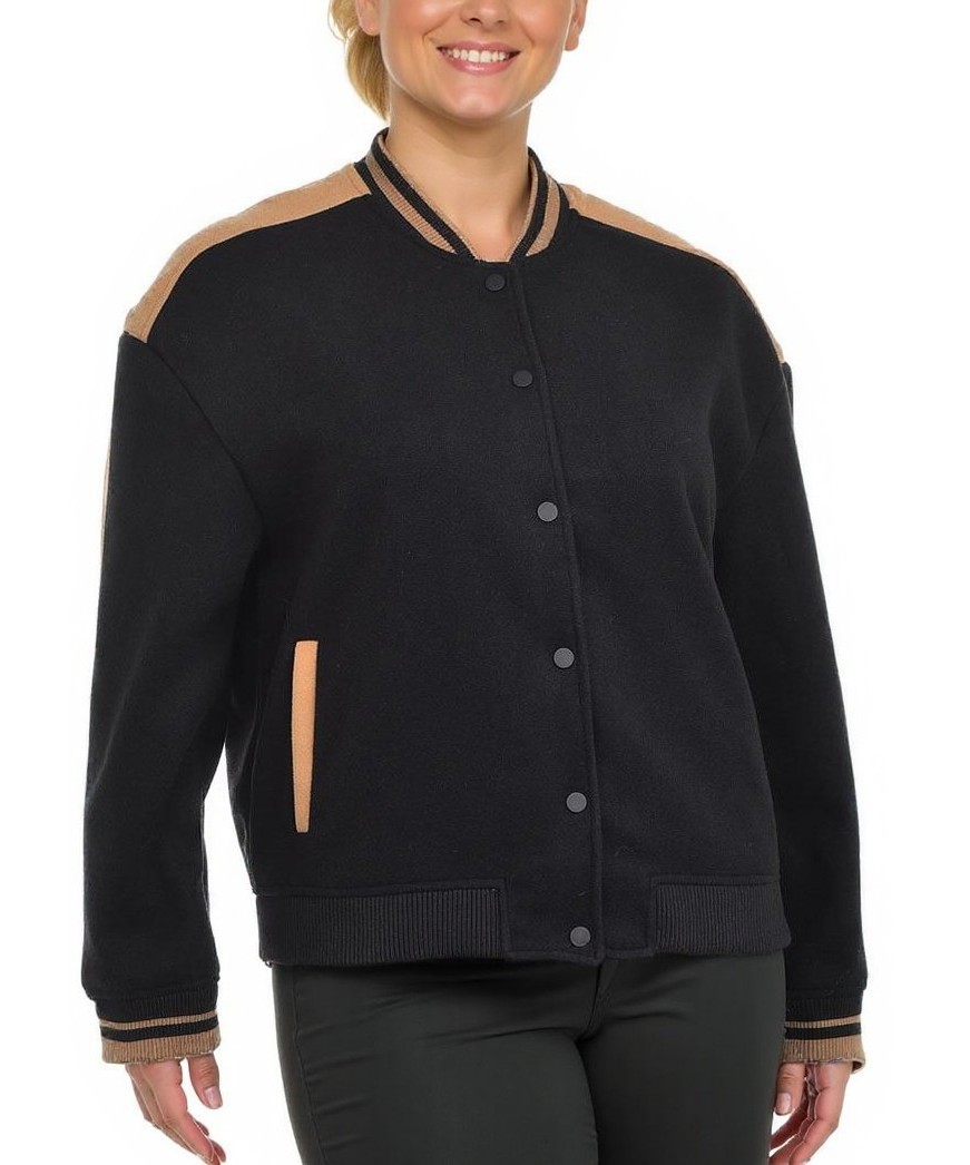 Дамско бомбър яке в черно с контрастни бежови детайли на раменете и джобовете. Закопчава се с капси, рипсени маншети и подгъв. Уютно, модерно и универсално за всеки аутфит. Стилна ежедневна визия. За.