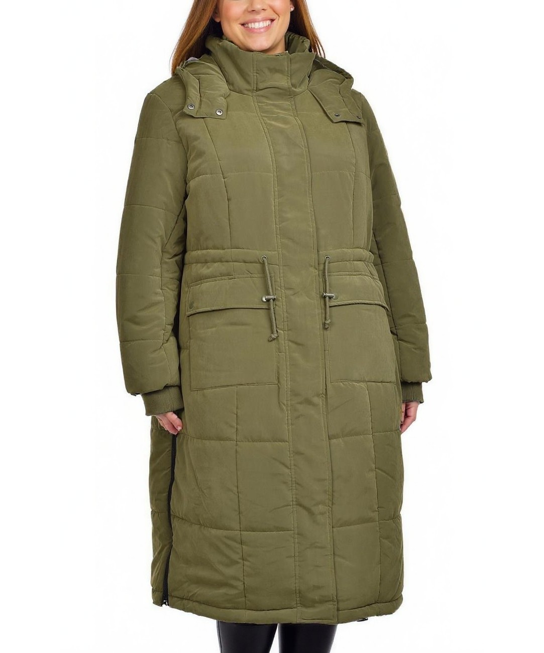 Дълго дамско пухено яке в маслено-зелено с качулка и висок яка. Топло и непромокаемо, с регулируема талия, големи джобове и странични ципове за лесно движение. Идеално за студено време. Модерно и уютно.