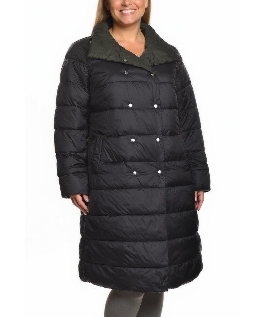 Двулицево дамско яке с висок шал-яка, пухено пълнене и хоризонтални шевове. Едната страна - матово черно с копчета, другата - тъмнозелена, практично и стилно за студените дни. Удобно и топло всеки ден