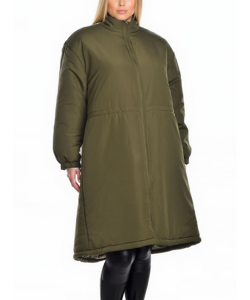 Дълго дамско яке с елек в хаки цвят, с прав силует и централен цип. Топло и удобно за ежедневие, практично за студено време, с леки подплънки и еластични маншети за удобство. Идеално за всеки ден.
