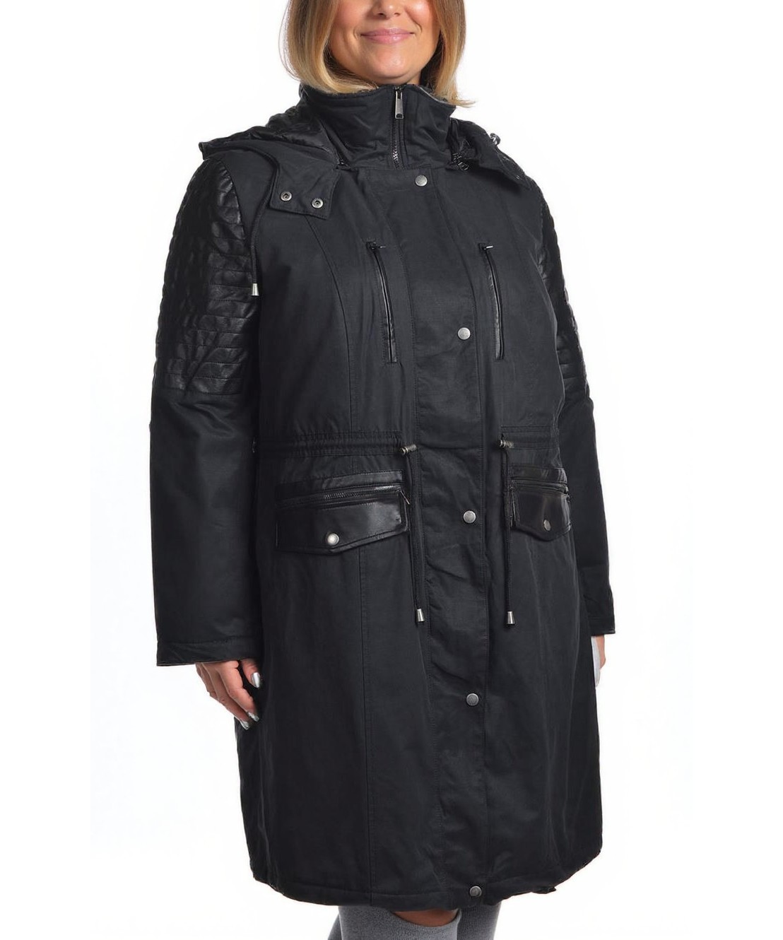 Дълго дамско памучно яке с подвижна качулка, стилни детайли и практични джобове. Регулируема талия, цип и копчета за по-добро затваряне. Удобно и топло за есенно-зимния сезон.