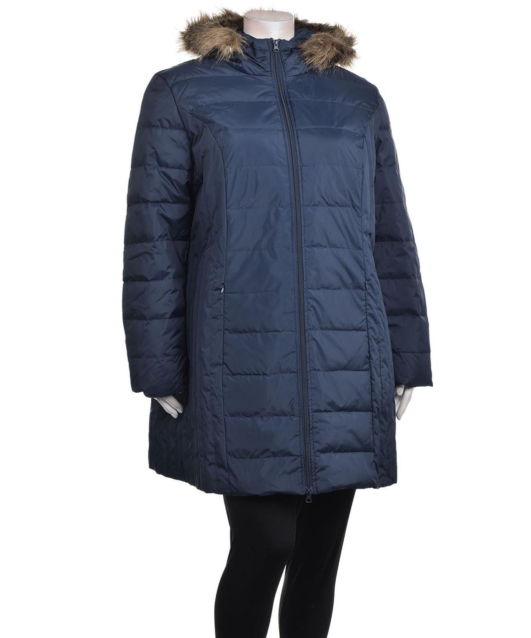 Дамско дълго зимно яке в тъмносиньо, с мека пухена качулка и вата от пера за топлина. Прав силует, двоен цип, дискретни странични джобове и водоотблъскваща материя. Лесно за поддръжка, топло и стилно.