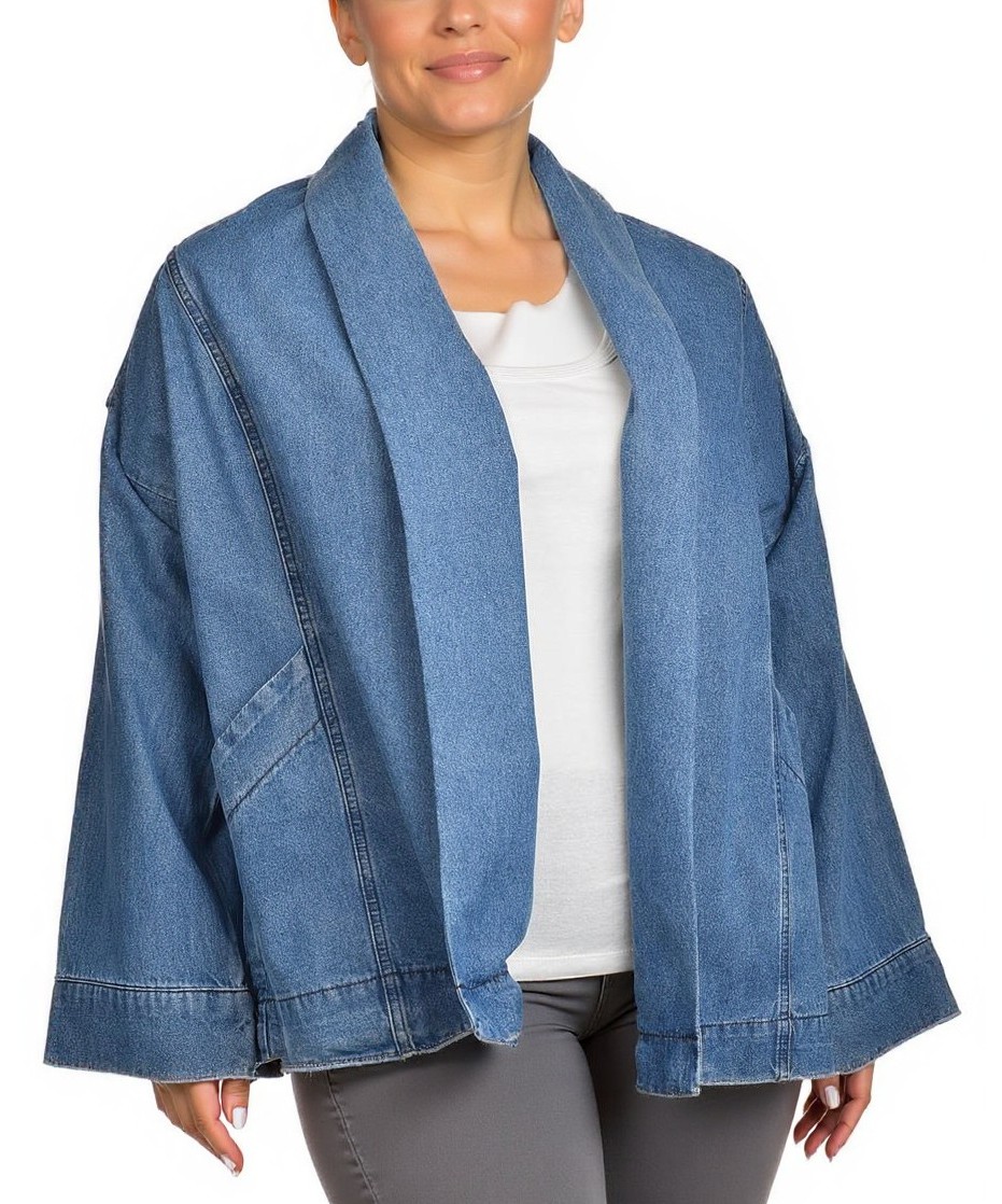 Дамско яке от памук в син деним цвят. Свободен крой за комфорт и стил, подходящо за ежедневно носене. Модерен дизайн с дълги ръкави и отворен преден стил. Отличен избор за всякакъв сезон.