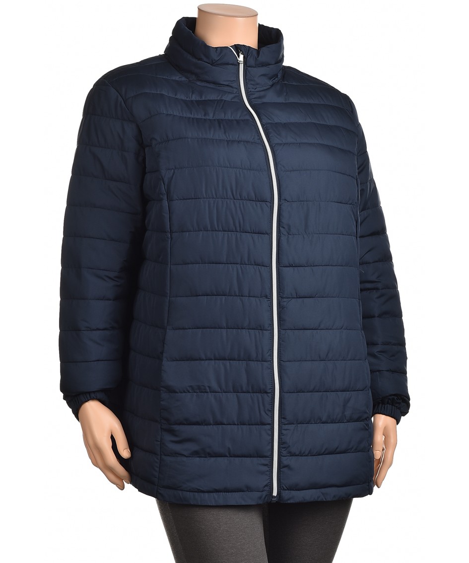 Стилно дамско яке в тъмносиньо с хоризонтална прошивка, леко и топло. Прав силует, висока яка и централен цип с контрастна лента. Удобни джобове, еластични маншети, подходящо за всеки ден. Практичен!!