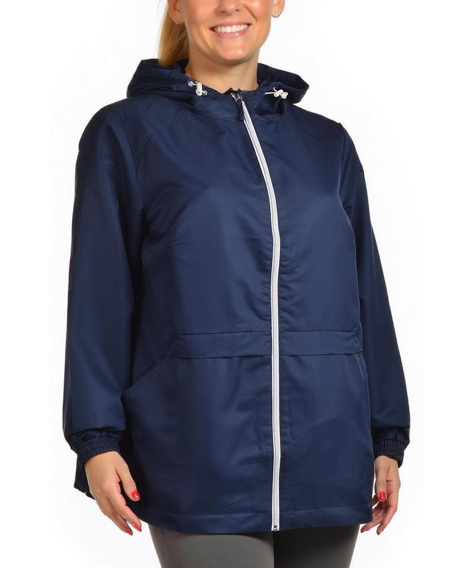 Дамска ветровка тъмно синя с качулка и бял цип, регулируеми връзки, еластични маншети и дискретни джобове. Лека, ветро- и водоотблъскваща, удобна за всекидневен градски стил. Практичен модерен избор.