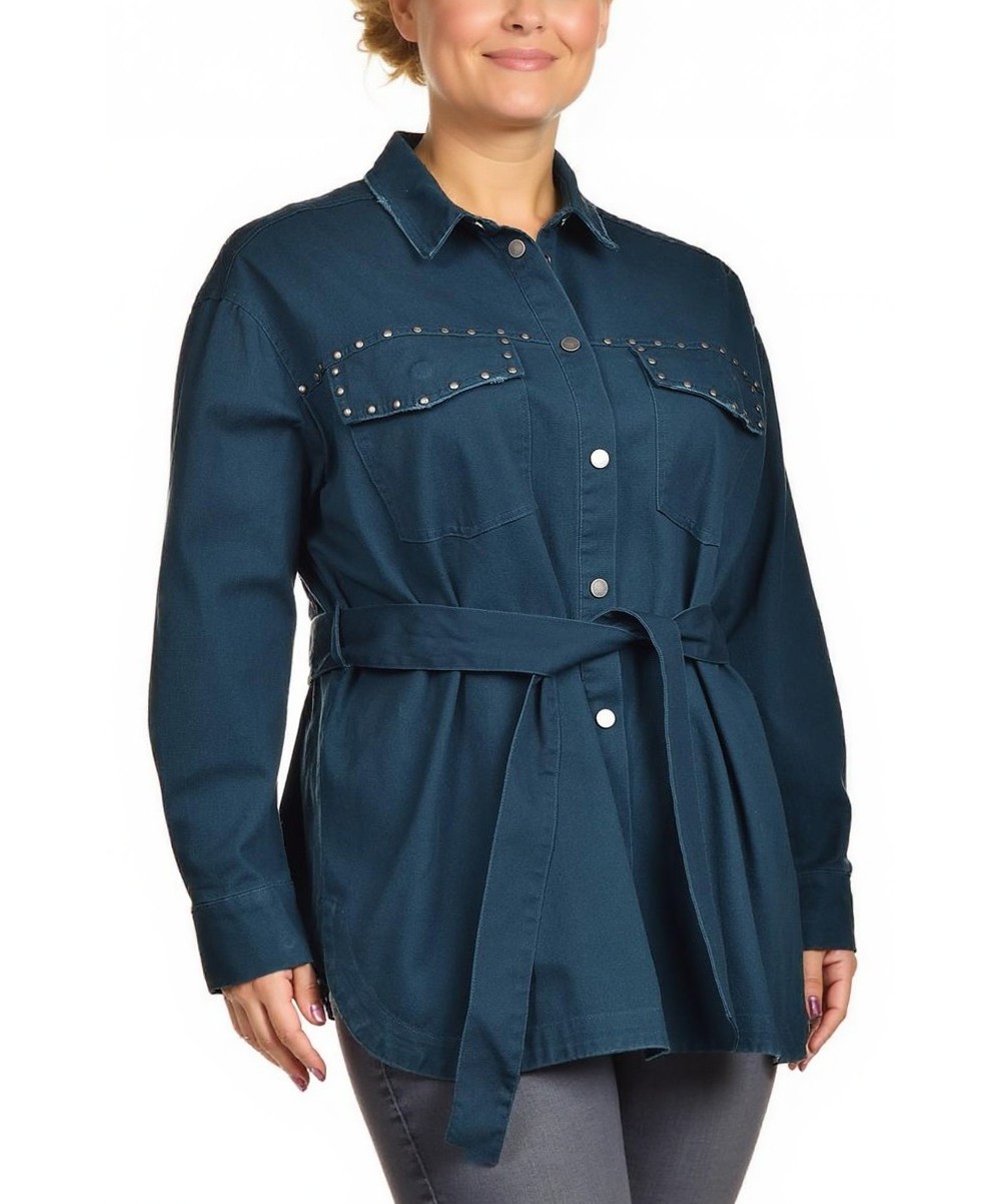 Стилно дамско яке от памук, тъмносин цвят с дълъг ръкав и копчета отпред. Декорирано с метални капси на джобовете и колан на талията за подчертаване на силуета. Подходящо за ежедневна визия.