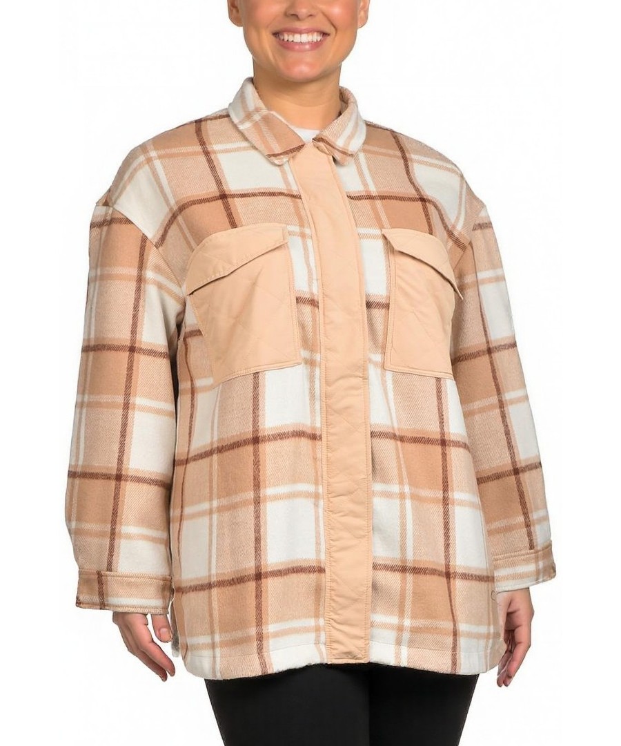 Дамско яке тип риза в бежово-кремово каре, с широк силует, дълги ръкави и предни джобове с капаци. Меко и топло, удобно за ежедневни аутфити през преходния сезон. Стилен избор. Идеално за студени дни.