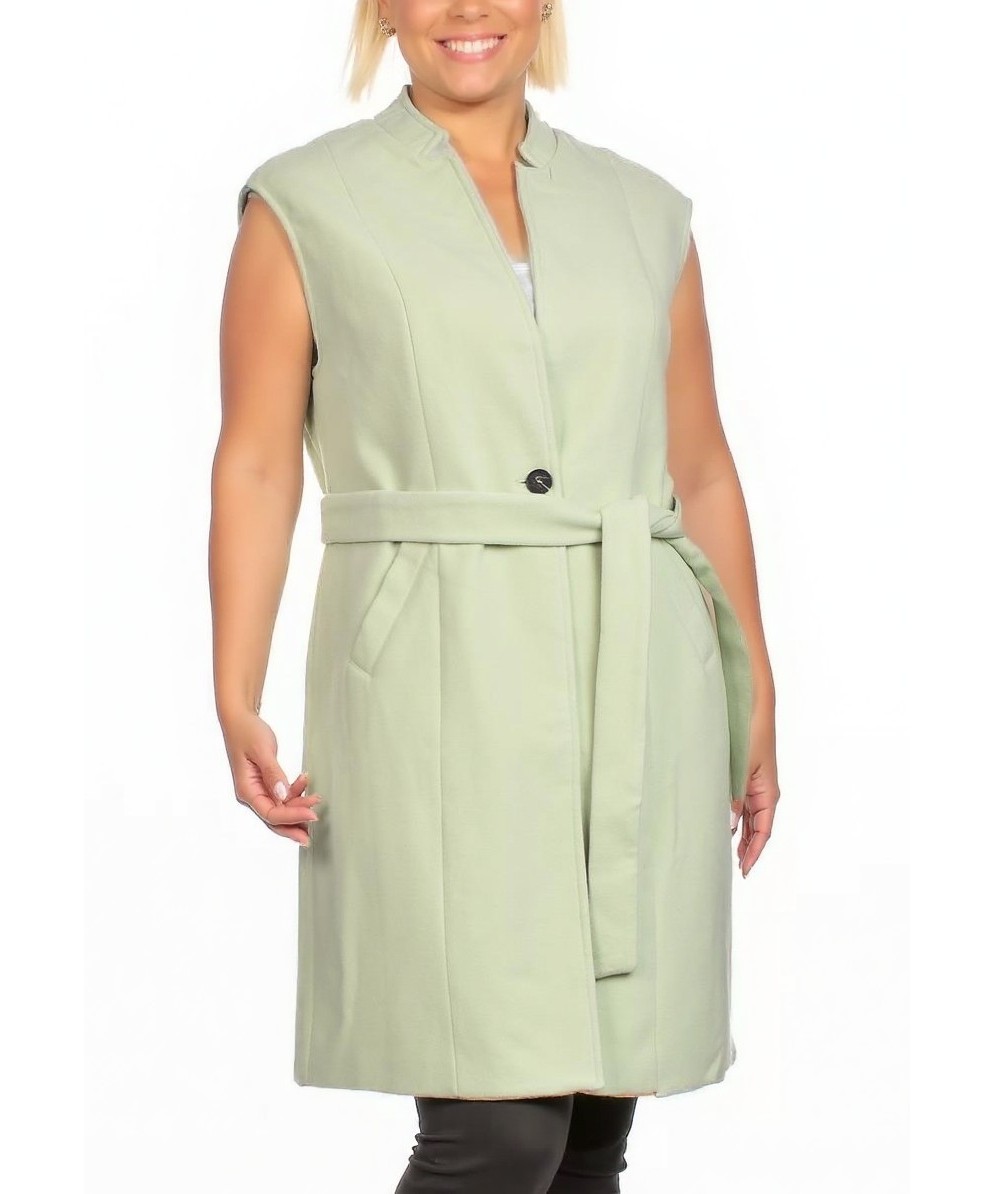 Дамско манто без ръкави от вискоза в мека мента. Средна дължина, колан за връзване, джобове и едно копче. Изчистен силует, комфортно и елегантно за всеки ден и специални поводи. Лесно се комбинира! :)