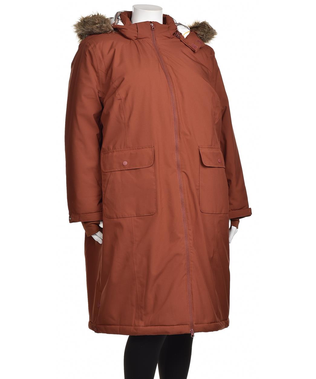Дълго дамско непромокаемо яке в топъл ръждив нюанс, с качулка с пухена апликация, централно закопчаване с цип, джобове с капаци и удобна вталена кройка за зимни дни. Водоустойчиво, с топла подплата.