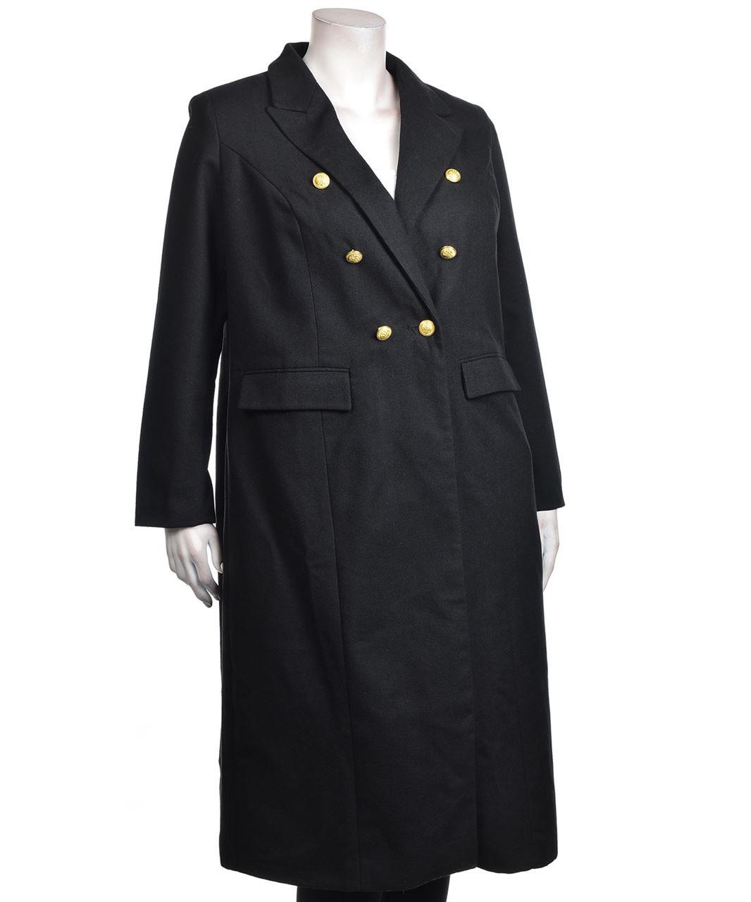 Елегантно черно дамско палто с дълга кройка и двуредно закопчаване с метални златисти копчета. Класическо, прав силует, ревери и фалшиви джобове – идеално за официални и ежедневни визии. Уютна и стилна