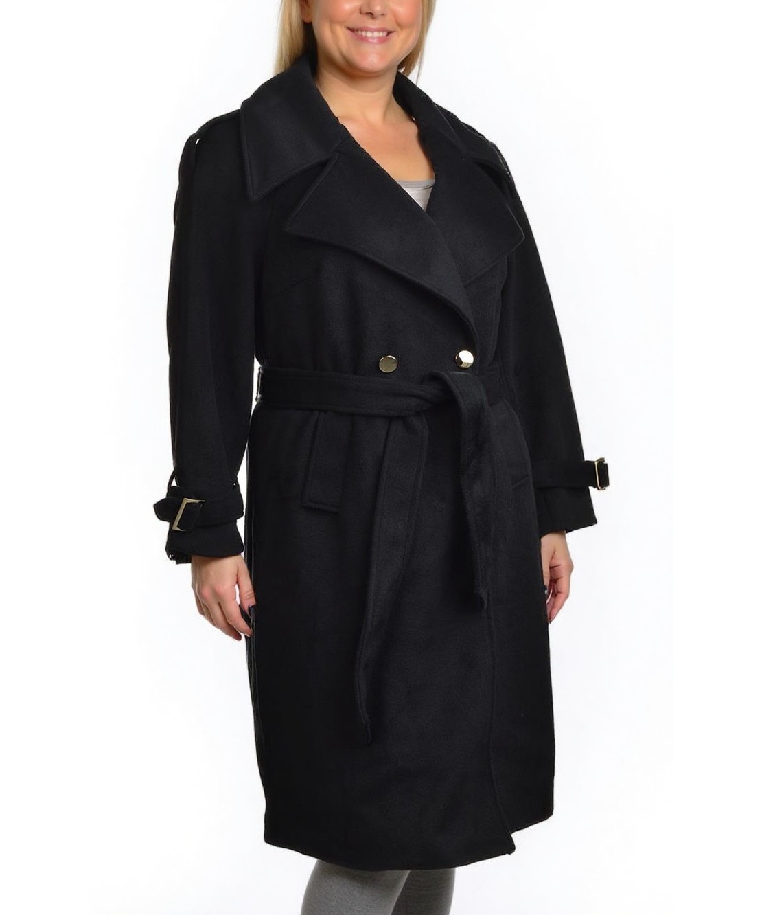 Елегантно дамско палто в тъмно черен цвят с широки ревери, колан и метални копчета. Има джобове и декорация с катарами на ръкавите. Дължина до коляното — практично и стилно за есен/зима. Топло и удобно.